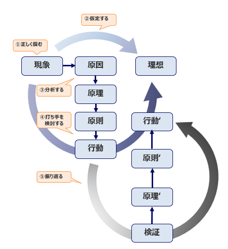 仮説にすぎないからこそ、ステップ④で仮説の原理から原則、打ち手を導き出したとしても、それも仮説にすぎないので、ステップ⑤で行動と検証を繰り返すことが重要になります。